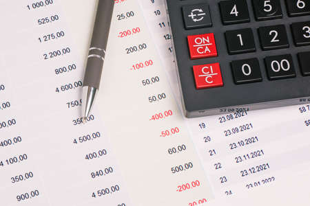 Financial accounting, budgeting, stock market concept. Pen and calculator on sales report