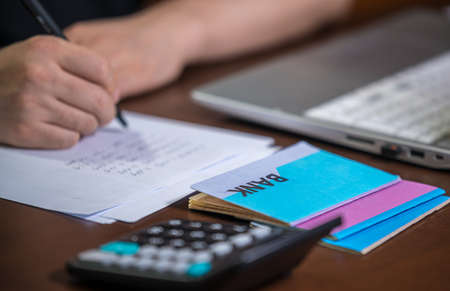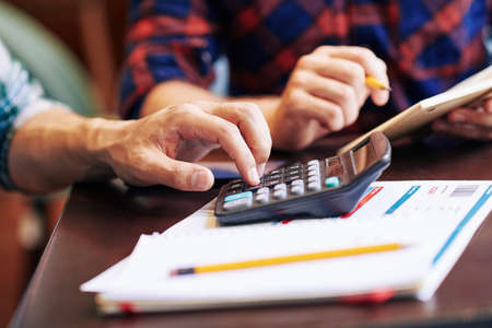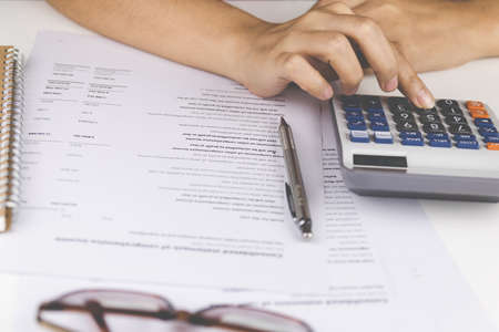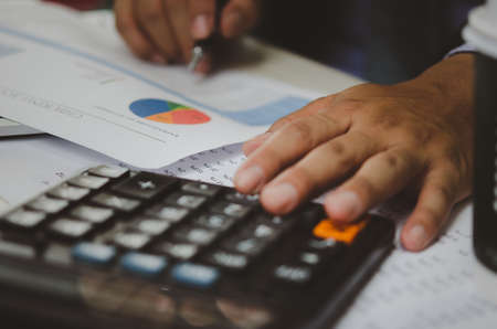 The office man calculate bills with using calculator in home office. financial concept.