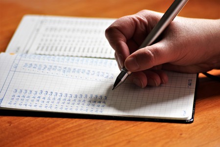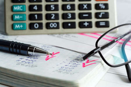 Calculations and account book and pen