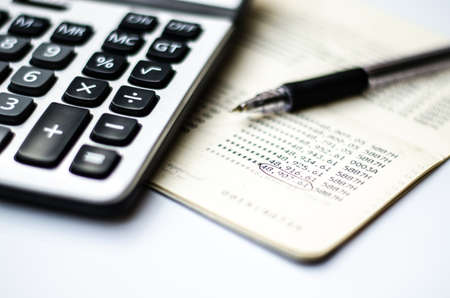 Bank account passbook with pen and calculator