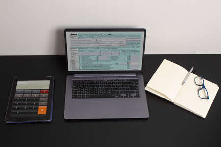 Close up Tax form 1040, blank income tax forms with calculator, glasses, and a computer keyboard on the desk