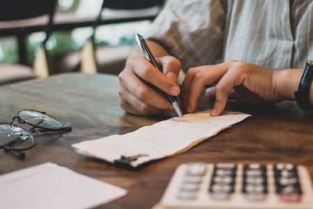 Man hand holding bill and pen with calculator expense or tax receipt. business finance concept.