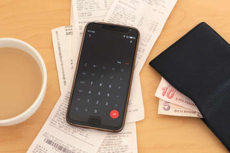 calculating bills for month, budget is limited. only some cash is in a wallet on a table. coffee helps to concentrate
