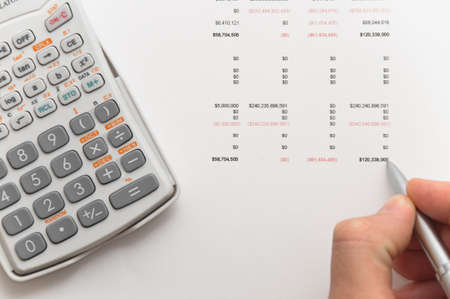 Hand writing figures on financial balance sheet