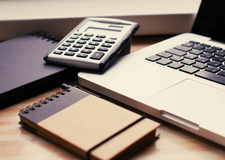 vintage tone effect with business man using calculator to calculate budget and partnership using computer at work
