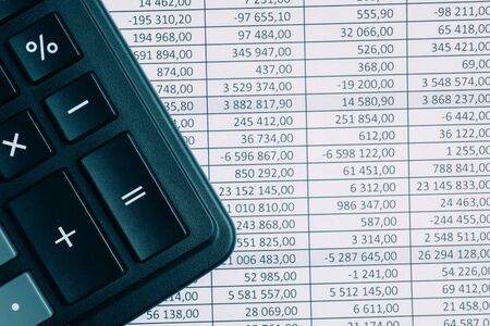 Calculator on paper background with totals left side. Concept financial reports. Toned. Copy space.