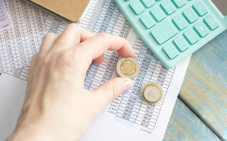 Several euro coins from 10 cents to 2 euro stacked on the printed table with data