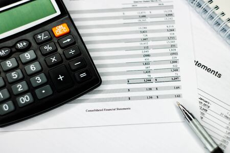 Calculator and pen Placed on accounting documents. Select focus Calculator button. Financial business concept
