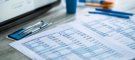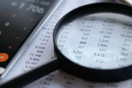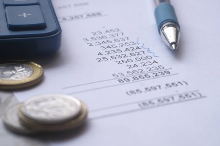 Finance savings concept, business equipment on paperwork. Financial analysis - income balance statement