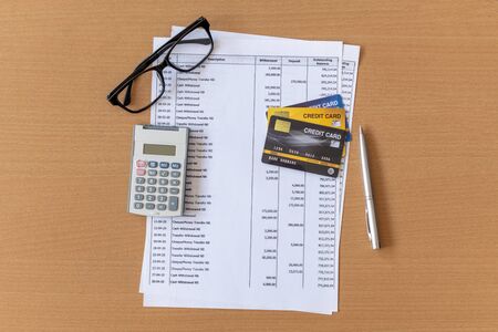 Calculator and Pen on Bank statement and credit card on a Wooden table