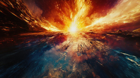A breathtaking depiction of an abstract cosmic explosion showcasing fiery colors and dynamic lighting reflected across water. This mesmerizing scene inspires awe and wonder, capturing the beauty of the universe.