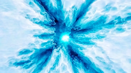 Soaring over a breathtaking frozen tundra, capturing mesmerizing ice and snow patterns with sunlight filtering through a central opening, creating a dramatic scene