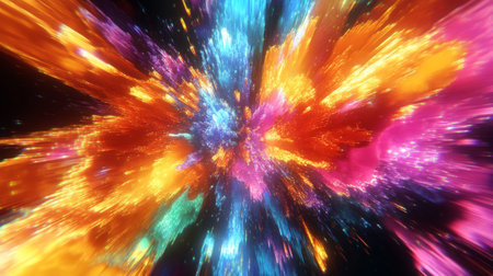 An explosion of vibrant colors and dynamic light creates an immersive cosmic effect, evoking a sense of movement and energy in an abstract space background.