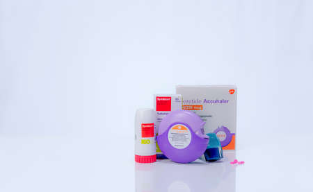 CHONBURI, THAILAND-MARCH 28, 2020 : Symbicort turbuhaler, seretide accuhaler, ventolin evohaler, and pink tablets pills. Asthma inhaler. Medicine for treatment asthm, COPD, and emphysema. Drug package