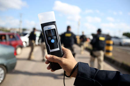 simoes Filho, Bahia, Brazil - October 11, 2018: Agent of the Federal Highway Police - PRF - inspects a driver on federal highway BR 324 in the city of Simoes Filho.
