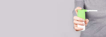 Female hand with inhaler on gray background