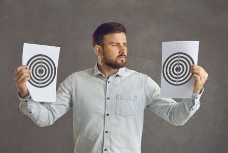 Serious young man holding two sheets of paper with shooting targets standing isolated on gray background. Concept of setting business goals and objectives and choice of marketing strategy