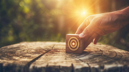 A hand holding a wooden target with a red arrow pointing to the center. Concept of aiming for a goal or target, and the importance of focus and determination in achieving it