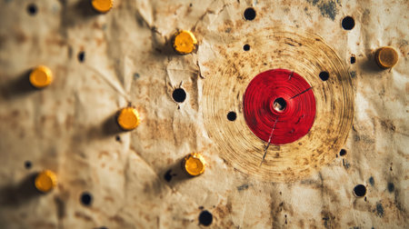 Close-up image of a bullseye from an archery target, partially wet from raindrops. an arrow is seen striking the center with precision, intense focus and accuracy. perfect for themes on sports, success, determination, and perseverance. Generative AI