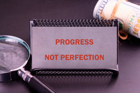 A sleek desk showcases a silver card holder displaying the powerful message of progress not perfection, accompanied by a magnifying glass, inspiring motivation and focus.