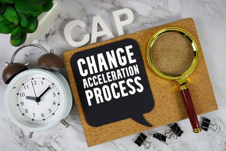 CAP Change Acceleration Process text with alarm clock and magnifying glass on marble background