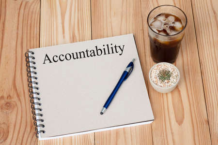 Accountability concept on notebook, pen cactus and coffee cup on wooden table. Business concept.