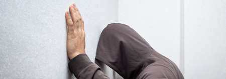 The handcuffed offender regrets the crime and hides his face. The arrested man in handcuffs.