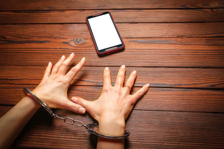 the criminal hides his face and regrets,woman handcuffed regrets her crime