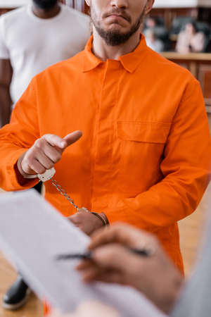cropped view of accused man in handcuffs pointing at lawsuit near blurred prosecutor