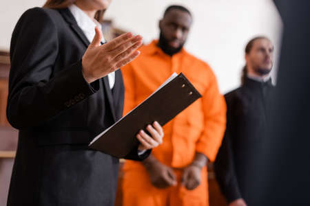 prosecutor with clipboard pointing with hand near accused african american man on blurred background