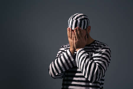 Remorseful prisoner in striped uniform with handcuffs hiding his face on black background, space for text