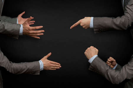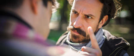 Close-up finger pointing of two very angry, nervous and upset men in an aggressive and fierce quarrel conflict on the verge of a physical confrontation and a fight. Concept of male conflict