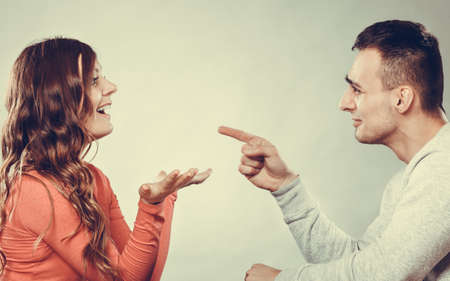 Negative emotions concept. People in fight. Husband and wife arguing and yelling on each other. Expressive and emotional couple having argument.