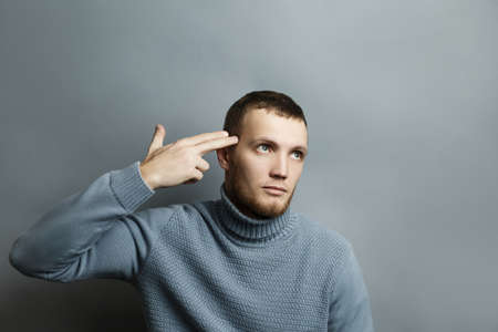 Young man in sweater pointing fingers to head as if he about shoot himself isolated on grey background Studio photo