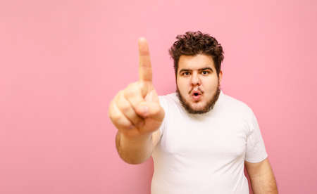 Funny surprised fat man with curly hair and beard looks and touches camera with shocked face on pink background. Overweight guy points his finger at the camera.