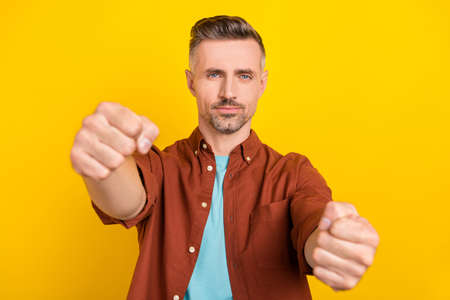 Photo of confident mature grey hairdo man drive car wear brown shirt isolated on vivid yellow color background