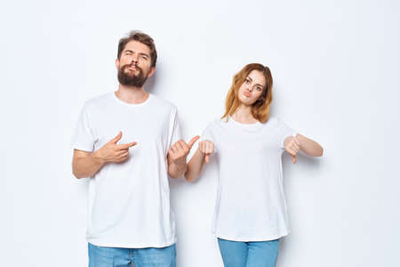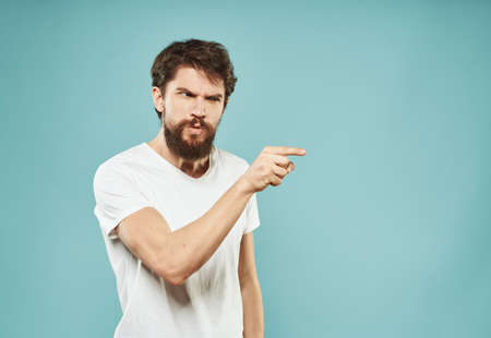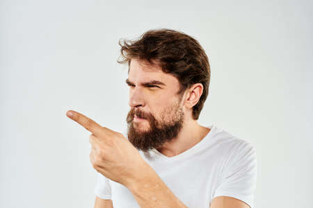 Emotional bearded man in a white t-shirt gestures with his hands light background
