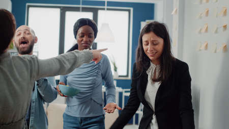 portrait of a young angry businessman pointing the finger at the sad woman with the clipboard.