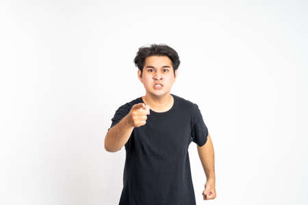 Portrait of angry aggressive caucasian man with a beard pointing hand to the camera at indoor studio shot isolated on white background. He has a quarrel