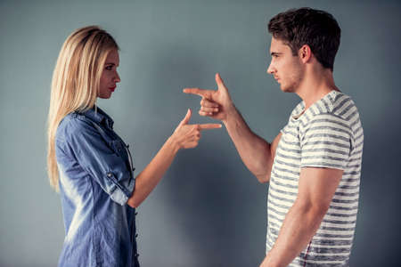 Beautiful young man and woman are pointing hand-guns at each other, on gray background