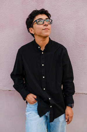 Young transgender man leaning on a wall while posing outdoors on the street.