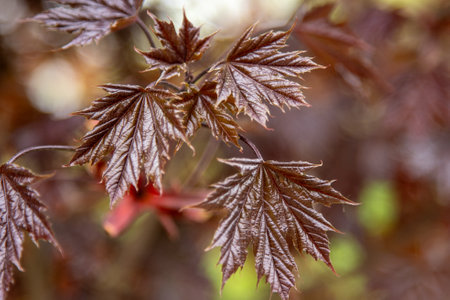 Maple leaves in early spring. Selective focus with shallow depth of field.