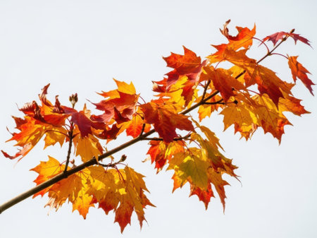 Autumn maple leaves on a tree branch against a white sky.