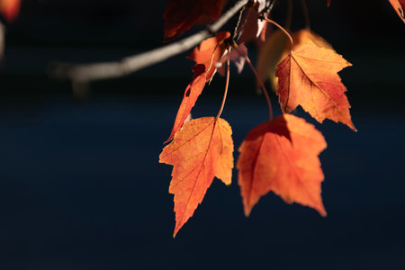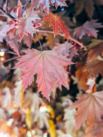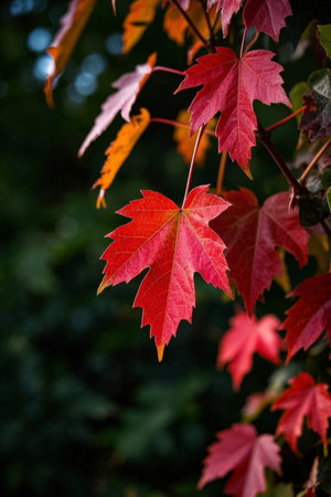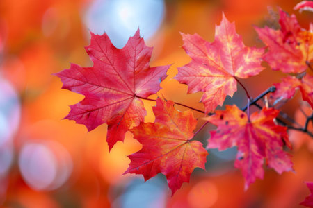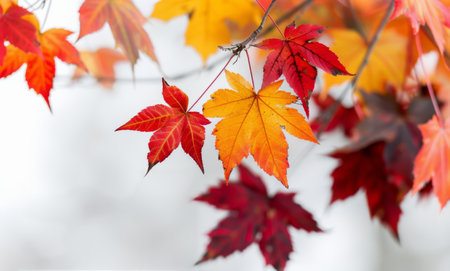 Close-up shot of vibrant autumnal maple leaves. Rich colors and intricate details.