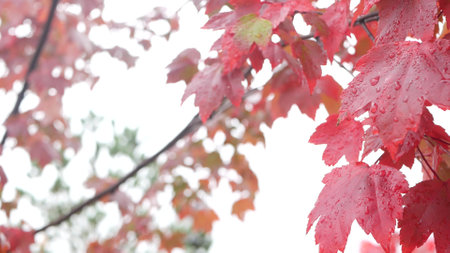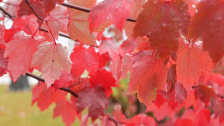 Rain drops on red autumn maple tree leaves. Water droplets, wet fall leaf in forest or woods. September, october or november weather. Leafage in moist park . Seasonal foliage on plant branch.