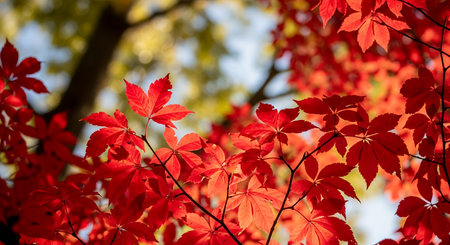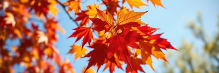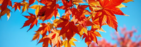 Colorful autumn leaves display vibrant hues of red and orange against a clear blue sky in a serene outdoor setting