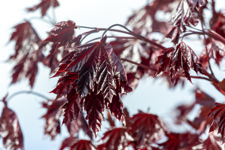 Macro shot of crimson foliage maple tree in bloom during the spring season with hazy backdrop.
