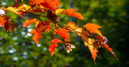 Colorful leaves in shades of red and green catch sunlight in a park, signaling the arrival of autumn.