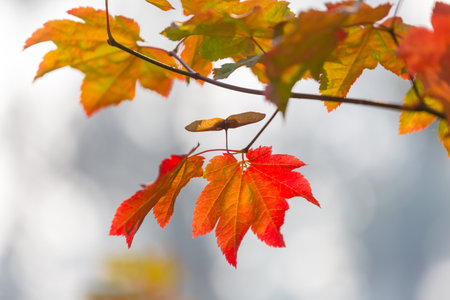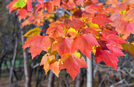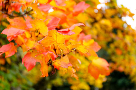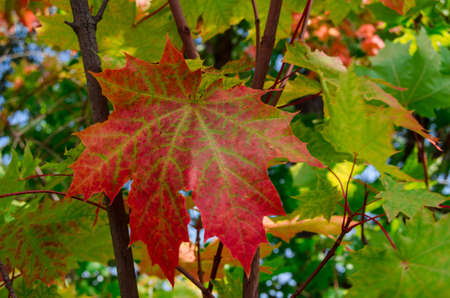 Tree branch close up in fall. Maple trees with leaves changing colors in local park in autumn.