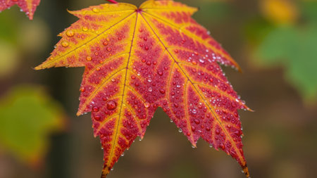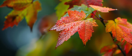 Vibrant autumn maple leaves with water droplets close up